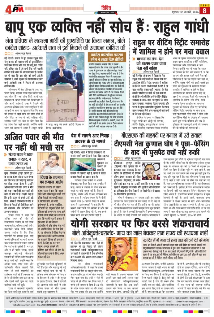 लोकसभा में नेता प्रतिपक्ष ने एक्स पर पोस्ट किया, महात्मा गांधी एक व्यक्ति नहीं, एक सोच हैं -वह सोच जिसे कभी एक साम्राज्य ने, कभी नफऱत की विचारधारा ने और कभी अहंकारी सत्ता ने मिटाने की असफल कोशिश की। मगर राष्ट्रपिता ने हमें आज़ादी के साथ यह मूलमंत्र दिया कि सत्ता की ताक़त से बड़ी सत्य की शक्ति होती है और हिंसा व भय से बड़े अहिंसा और साहस। उन्होंने इस बात पर जोर दिया कि यह सोच मिट नहीं सकती, क्योंकि गांधी भारत की आत्मा में अमर हैं। राहुल गांधी ने कहा, बापू को उनके शहीदी दिवस पर विनम्र श्रद्धांजलि।