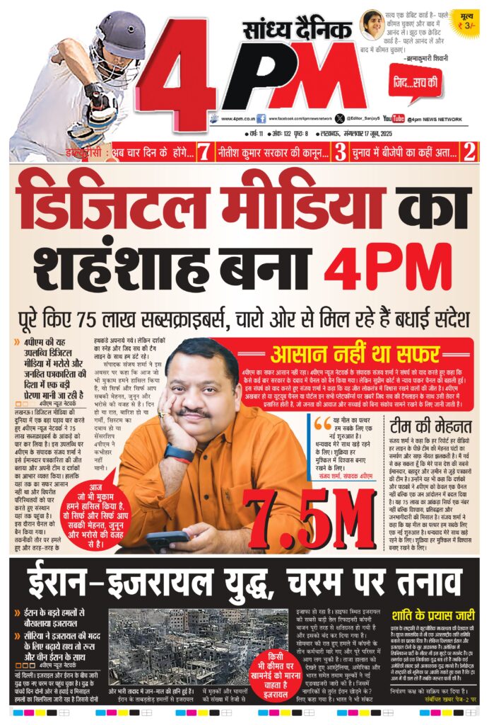 संजय शर्मा ने कहा कि हर रिपोर्ट हर वीडियो हर लाइन के पीछे टीम की मेहनत घंटों का समर्पण और साफ़ नीयत झलकती है। मैं गर्व से कह सकता हूँ कि मेरे पास देश की सबसे ईमानदार, बहादुर और ज़मीन से जुड़े पत्रकारों की टीम है। उन्होंने यह भी कहा कि दर्शकों और पाठकों ने 4पीएम को केवल एक चैनल नहीं बल्कि एक जन आंदोलन में बदल दिया है। यह 75 लाख का आंकड़ा सिर्फ एक नंबर नहीं बल्कि विश्वास, प्रतिबद्धता और जनभागीदारी की मिसाल है। संजय शर्मा ने कहा कि यह मील का पत्थर हम सबके लिए एक नई शुरुआत है। धन्यवाद मेरे साथ खड़े रहने के लिए। शुक्रिया हर मुश्किल में विश्वास बनाए रखने के लिए।