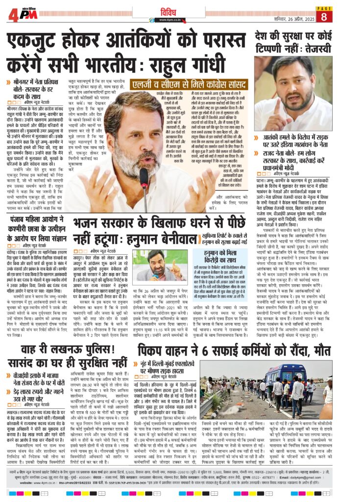 उन्होंने जोर देते हुए कहा कि एकजुट विपक्ष इस कार्रवाई की निंदा करता है, जो भी कार्रवाई की जाएगी हम उसका समर्थन करते हैं। राहुल गांधी ने कहा कि यह जरूरी है कि सभी भारतीय एकजुट हों, ताकि हम आतंकवादियों और उनके इरादों को परास्त कर सकें। उन्होंने कहा कि यह बहुत महत्वपूर्ण है कि हर एक भारतीय एकजुट होकर खड़ा हो, साथ खड़ा हो, ताकि हम आतंकवादियों द्वारा की जा रही कोशिशों को परास्त कर सकें। यह देखकर दुख होता है कि कुछ लोग कश्मीर और देश के बाकी हिस्सों से मेरे भाइयों और बहनों पर हमला कर रहे हैं और मुझे लगता है कि यह बहुत महत्वपूर्ण है कि हम सभी एक साथ खड़े हों, एकजुट होकर इस घिनौनी कार्रवाई का मुकाबला करें और आतंकवाद को हमेशा के लिए परास्त करें।
