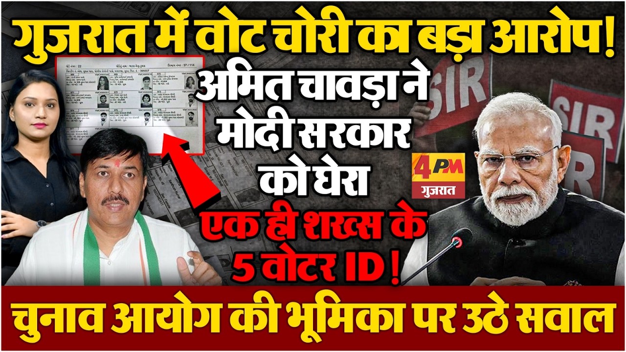 4पीएम न्यूज नेटवर्कः गुजरात की राजनीति में एक बार फिर चुनावी पारदर्शिता को लेकर बड़ा विवाद खड़ा हो गया है.. राज्य में कथित तौर पर वोट चोरी या डुप्लीकेट वोटर आईडी से जुड़े गंभीर आरोप सामने आए हैं.. कांग्रेस नेता अमित चावड़ा ने इन आरोपों को लेकर केंद्र सरकार.. और चुनाव आयोग दोनों पर सवाल उठाए हैं.. उनका कहना है कि यह कोई नई समस्या नहीं है.. बल्कि लंबे समय से चली आ रही एक व्यवस्थित गड़बड़ी है.. आपको बता दें कि अमित चावड़ा का दावा है कि.. गुजरात में बड़ी संख्या में डुप्लीकेट मतदाता मौजूद हैं.. उनका आरोप है कि एक ही व्यक्ति के नाम पर कई वोटर आईडी कार्ड बनाए गए हैं.. कुछ मामलों में तो एक ही व्यक्ति, एक ही फोटो और एक ही नाम के साथ 5 अलग-अलग वोटर आईडी नंबर होने की बात कही जा रही है..