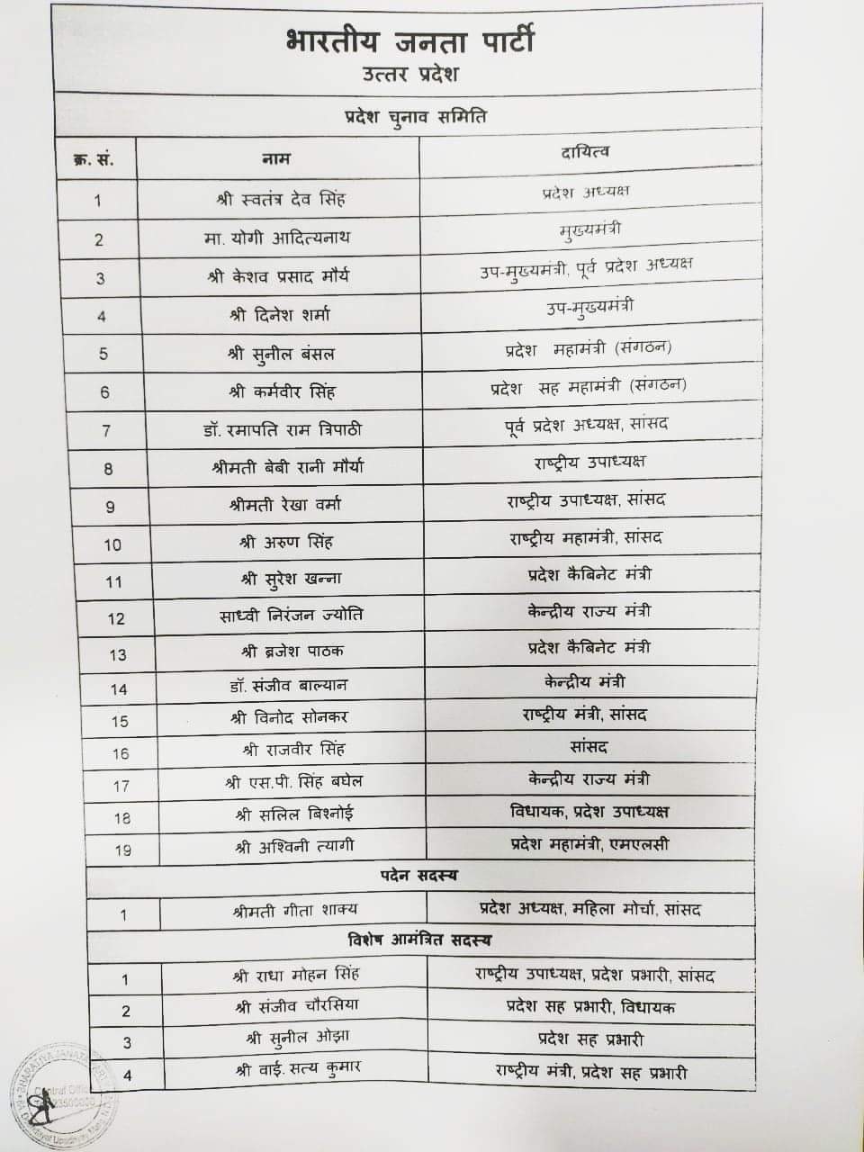 भाजपा की प्रदेश चुनाव समिति घोषित, एक भी मुस्लिम नाम नहीं है शामिल