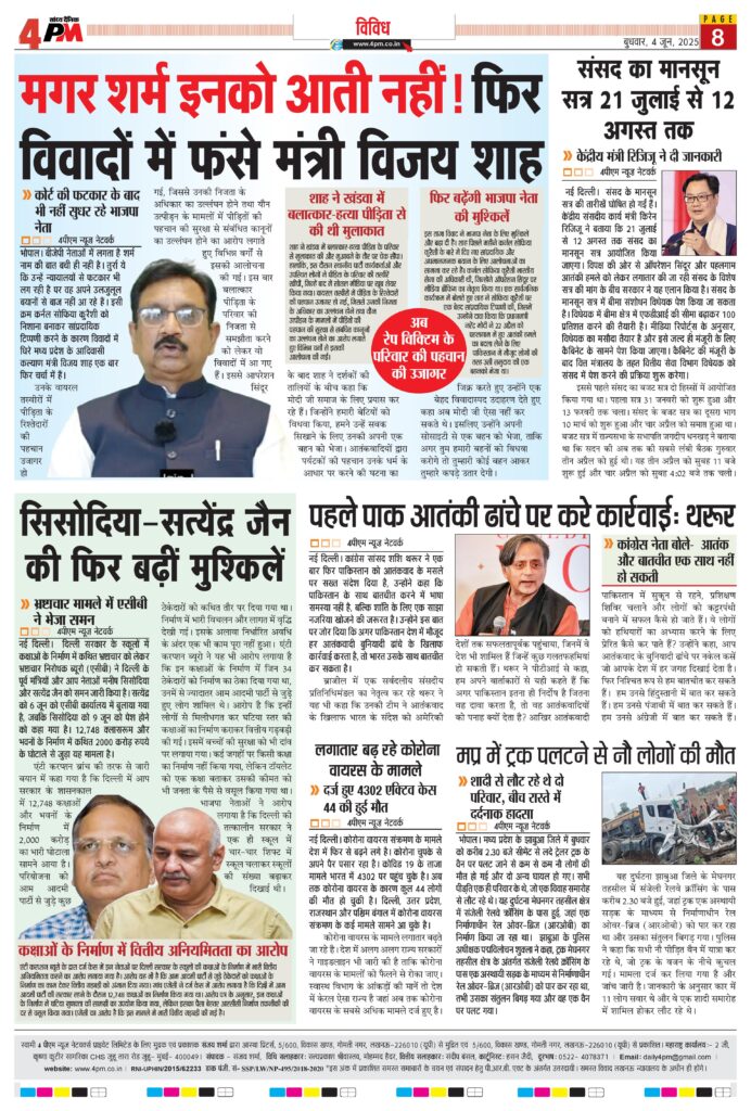 नई दिल्ली। कोरोना वायरस संक्रमण के मामले देश में फिर से बढऩे लगे है। कोरोना चुपके से अपने पैर पसार रहा है। कोविड 19 के ताजा मामले भारत में 4302 पर पहुंच चुके है। अब तक कोरोना वायरस के कारण कुल 44 लोगों की मौत हो चुकी है। दिल्ली, उत्तर प्रदेश, राजस्थान और पश्चिम बंगाल में कोरोना वायरस संक्रमण के कई मामले सामने आ चुके है।