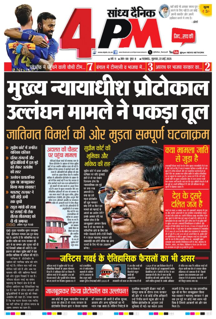 मुंबई। मुख्य न्यायधीश भूषण रामकृष्ण गवई प्रोटोकाल मामला अब तूल पकड़ रहा है। आरोप है कि संवैधानिक पद पर आसीन व्यक्ति को राज्य सरकार की ओर से वह सम्मान और सुरक्षा नहीं दी गई जिसकी अपेक्षा की जाती है। इस प्रकरण को लेकर सुप्रीम कोर्ट में एक जनहित याचिका भी दाखिल की गई है।