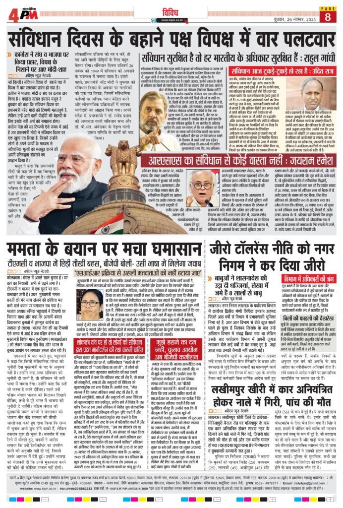 इस बीच, कांग्रेस नेता उदित राज ने सत्तारूढ़ शासन पर हमला करते हुए आरोप लगाया कि संविधान आज टुकड़े-टुकड़े हो रहा है। उन्होंने कहा, हम संविधान पर हमला नहीं होने देंगे। यह याद रखना चाहिए कि आज संविधान के टुकड़े-टुकड़े हो रहे हैं। 26/11 के मुंबई आतंकवादी हमले का जिक्र करते हुए राज ने कहा, आतंकवादी हमले कभी भी हो सकते हैं और संविधान विरोधी तत्व हमला करने से पहले संविधान दिवस नहीं देखते। वह भी संविधान पर हमला था। मैं शहीदों को श्रद्धांजलि अर्पित करता हूँ। प्रधानमंत्री नरेंद्र मोदी ने संविधान दिवस के अवसर पर देशवासियों को पत्र लिखा है। उन्होंने 1949 में संविधान के ऐतिहासिक अंगीकरण का स्मरण करते हुए इसकी राष्ट्र की प्रगति में मार्गदर्शक भूमिका को रेखांकित किया। प्रधानमंत्री ने यह भी बताया कि 2015 में सरकार ने 26 नवम्बर को संविधान दिवस घोषित किया था, जिससे इस पवित्र दस्तावेज का सम्मान किया जा सके। प्रधानमंत्री ने लिखा कि कैसे संविधान ने समान्य पृष्ठभूमि के लोगों को देश की सर्वोच्च सेवाओं में योगदान करने का सामर्थ्य दिया है। उन्होंने स्वयं संसद और संविधान के प्रति श्रद्धा के अपने अनुभव साझा किए. उन्होंने कहा कि 2014 में संसद की सीढय़िों पर नमन करना और 2019 में संविधान को अपने माथे पर रखना, यह सब उनकी श्रद्धा का प्रतीक रहा, प्रधानमंत्री ने कहा कि संविधान ने अनगिनत नागरिकों को सपने देखने और उन्हें साकार करने की शक्ति दी है।