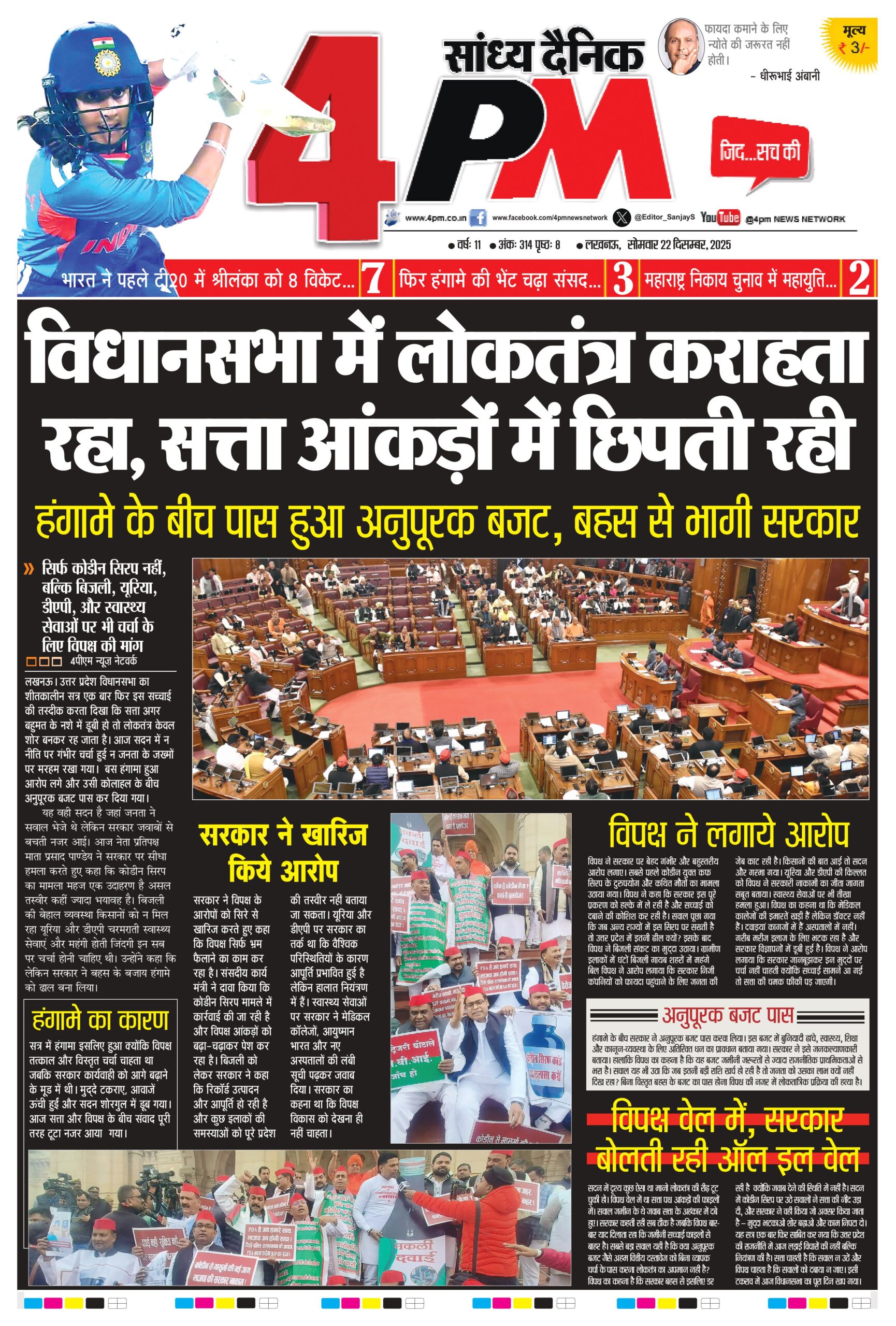 लखनऊ। उत्तर प्रदेश विधानसभा का शीतकालीन सत्र एक बार फिर इस सच्चाई की तस्दीक करता दिखा कि सत्ता अगर बहुमत के नशे में डूबी हो तो लोकतंत्र केवल शोर बनकर रह जाता है। आज सदन में न नीति पर गंभीर चर्चा हुई न जनता के जख्मों पर मरहम रखा गया। बस हंगामा हुआ आरोप लगे और उसी कोलाहल के बीच अनुपूरक बजट पास कर दिया गया। यह वही सदन है जहां जनता ने सवाल भेजे थे लेकिन सरकार जवाबों से बचती नजऱ आई। आज नेता प्रतिपक्ष माता प्रसाद पाण्डेय ने सरकार पर सीधा हमला करते हुए कहा कि कोडीन सिरप का मामला महज एक उदाहरण है असल तस्वीर कहीं ज्यादा भयावह है। बिजली की बेहाल व्यवस्था किसानों को न मिल रहा यूरिया और डीएपी चरमराती स्वास्थ्य सेवाएं और महंगी होती जिंदगी इन सब पर चर्चा होनी चाहिए थी। उन्होंने कहा कि लेकिन सरकार ने बहस के बजाय हंगामे को ढाल बना लिया।