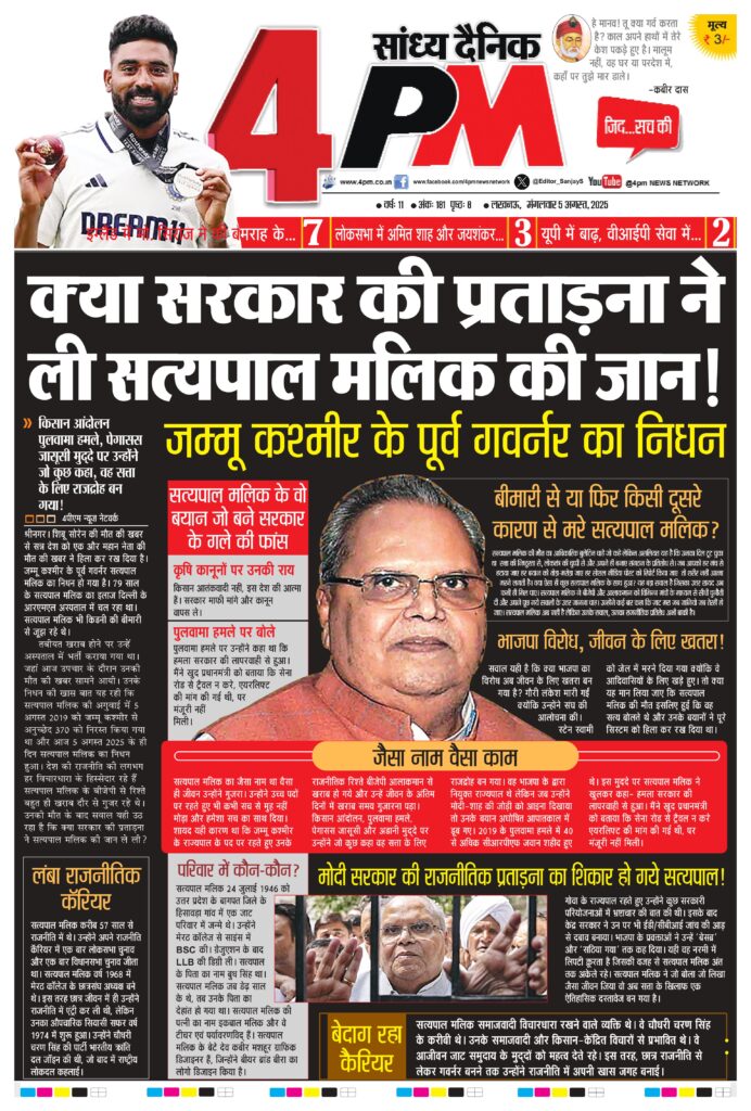 सत्यपाल मलिक की मौत का आधिकारिक बुलेटिन चाहे जो कहे लेकिन असलियत यह है कि उनका दिल टूट चुका था सत्ता की निष्ठुरता से, लोकतंत्र की चुप्पी से और अपने ही बनाए संगठन के प्रतिशोध से। जब आपको हर मंच से हटाया जाए हर बयान को तोड़ा-मरोड़ा जाए हर सोशल मीडिया पोस्ट को रिपोर्ट किया जाए तो शरीर नहीं आत्मा मरने लगती है। क्या ऐसा ही कुछ सत्यपाल मलिक के साथ हुआ? यह बड़ा सवाल है जिसका उत्तर शायद अब कभी ही मिल पाए। सत्यपाल मलिक ने बीजेपी और आलाकमान को विभिन्न मंचों के माध्यम से सीधी चुनौती दी और अपने पूछ गये सवालों के उत्तर जानना चाह। उन्होंने कई बार कहा कि जाट मरा जब जानियो जब तेरहीं हो जाए। सत्यपाल मलिक अब नहीं है लेकिन उनके सवाल, उनका राजनीतिक प्रतिरोध अभी बाकी है।