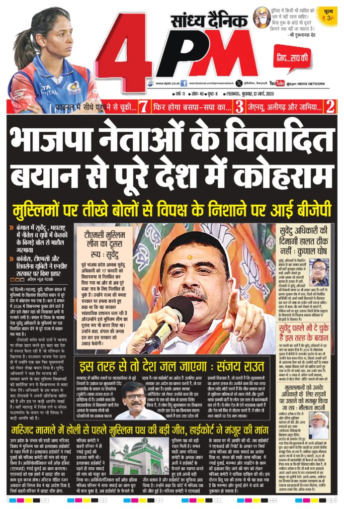 नई दिल्ली। महाराष्ट्र, यूपी, पश्चिम बंगाल में मुस्लिमों के खिलाफ विवादित बयान से पूरे देश में कोहराम मच गया है। बता दें बंगाल में 2026 में विधानसभा चुनाव होने वाले हैं और इसे लेकर वहां की सियासत अभी से गरमाने लगी है। बंगाल में विपक्ष के भाजपा नेता सुवेंदु अधिकारी के मुस्लिमों पर एक विवादित बयान देने से पूरे राज्य में बवाल मच गया है।