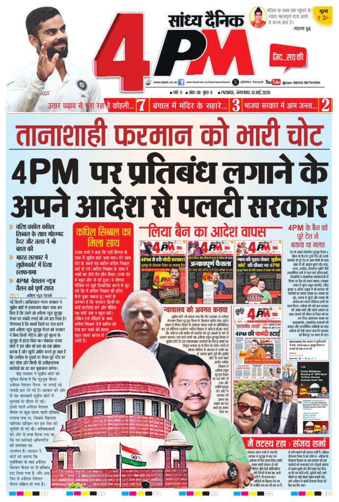 सुप्रीम कोर्ट को बताया गया कि केंद्र सरकार ने 4पीएम नेशनल चैनल यूट्यूब चैनल के खिलाफ पारित रोक आदेश वापस ले लिया। चैनल के संपादक संजय शर्मा का प्रतिनिधित्व कर रहे सीनियर एडवोकेट कपिल सिब्बल ने जस्टिस बीआर गवई और जस्टिस एजी मसीह की खंडपीठ को पूरे मामले के बारे में अवगत कराया। एक हफ्ते पहले जब 4पीएम न्यूज यूटयूब चैनल ने सुप्रीम कोर्ट में इस दमानात्मक कार्रवाई के विरूद्ध संघर्ष का बिगुल बजाया था तो विश्व के कोने—कोने से सोशल मीडिया के माध्यम से उसके पक्ष में आवाज बुलंद हुई थी। सुप्रीम कोर्ट के जाने माने वकील कपिल सिब्बल ने 4पीएम न्यूज यूटयूब चैनल का पक्ष कोर्ट में रखा और दलीलें प्रस्तुत की। कोर्ट ने सरकार को अपना पक्ष रखने का एक हफ्ते का समय दिया था।