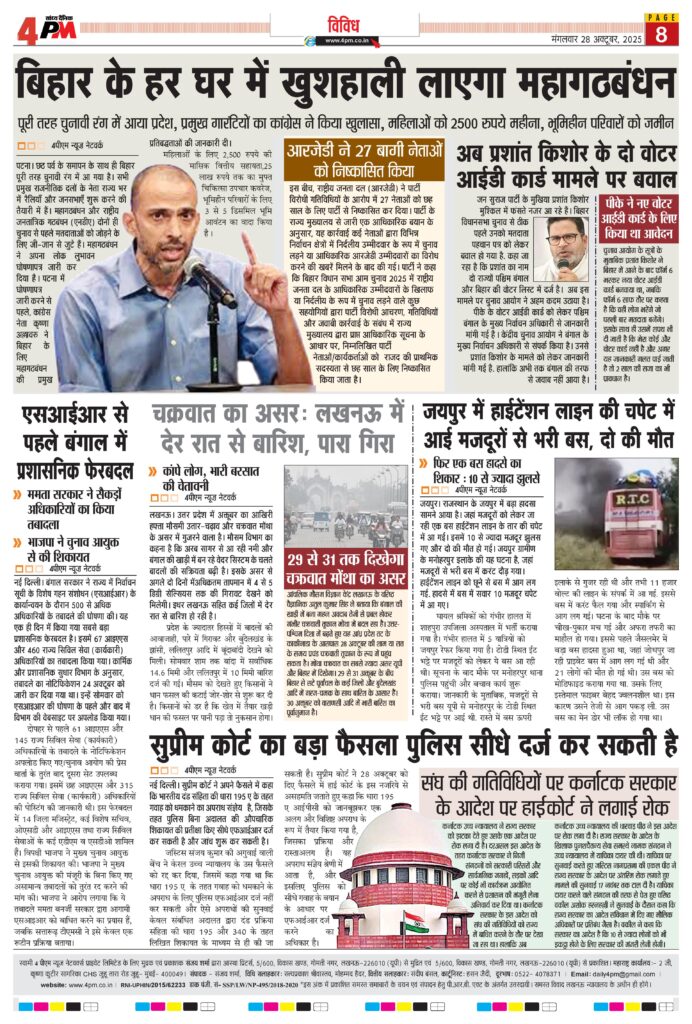 पटना। छठ पर्व के समापन के साथ ही बिहार पूरी तरह चुनावी रंग में आ गया है। सभी प्रमुख राजनीतिक दलों के नेता राज्य भर में रैलियाँ और जनसभाएँ शुरू करने की तैयारी में हैं। महागठबंधन और राष्ट्रीय जनतांत्रिक गठबंधन (एनडीए) दोनों ही चुनाव से पहले मतदाताओं को जोडऩे के लिए जी-जान से जुटे हैं। महागठबंधन ने अपना लोक लुभावन घोषणापत्र जारी कर दिया है। पटना में घोषणापत्र जारी करने से पहले, कांग्रेस नेता कृष्णा अल्लावरु ने बिहार के लिए महागठबंधन की प्रमुख प्रतिबद्धताओं की जानकारी दी।