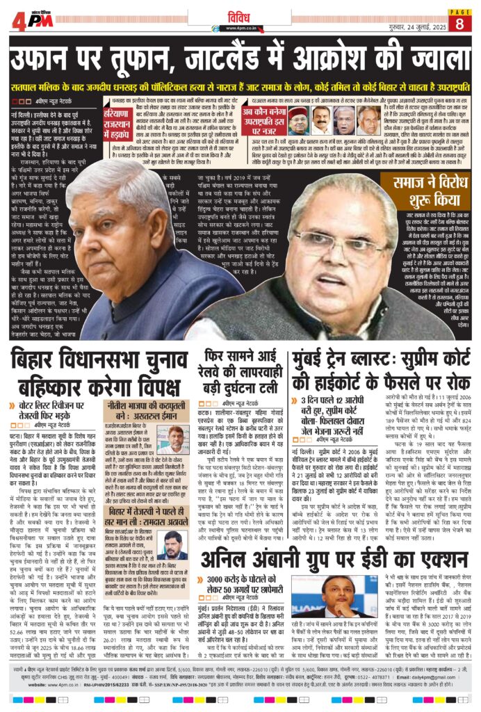 जैसा कभी सतपाल मलिक के साथ हुआ था उसी प्रकार से इस बार जगदीप धनखड़ के साथ भी वैसा ही हो रहा है। सतपाल मलिक को याद कीजिए पूर्व राज्यपाल, जाट नेता, किसान आंदोलन के पक्षधर। उन्हें भी धीरे-धीरे साइडलाइन किया गया। अब जगदीप धनखड़ एक तेज़तर्रार जाट चेहरा, जो भाजपा के सबसे बड़ी वकीलों में गिने जाते थे उन्हें भी साइड लाइन किया जा चुका है। वर्ष 2019 में जब उन्हें पश्चिम बंगाल का राज्यपाल बनाया गया था तब यही कहा गया कि संघ और सरकार उन्हें एक मजबूत और आक्रामक हिंदुत्व चेहरा बनाना चाहती है। लेकिन उपराष्ट्रपति बनते ही जैसे उनका स्वतंत्र सोच सरकार को खटकने लगा। जाट समाज खासकर राजस्थान और हरियाणा में इसे खुलेआम जाट अपमान कह रहा है। सोशल मीडिया पर जाट विरोधी सरकार और धनखड़ हटाओ तो वोट भूल जाओ कई दिनो से ट्रेंड कर रहा है।