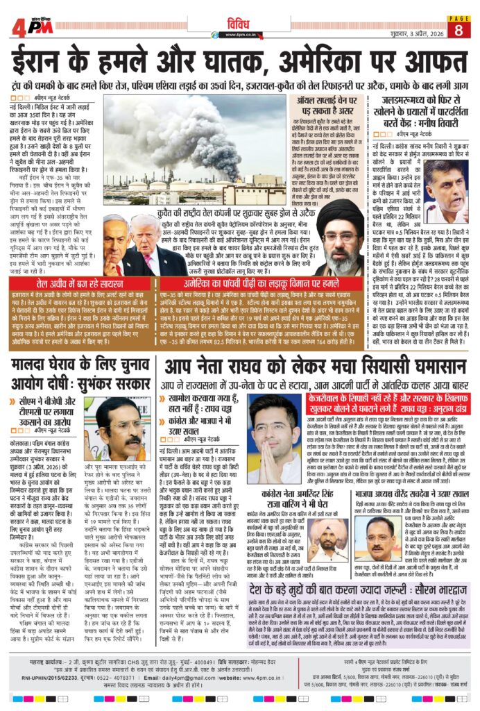 नई दिल्ली। मिडिल ईस्ट में जारी लड़ाई का आज 35वां दिन है। यह जंग खतरनाक मोड़ पर पहुंच गई है। अमेरिका द्वारा ईरान के सबसे ऊंचे ब्रिज पर किए हमले के बाद तेहरान पूरी तरह भडक़ा हुआ है। उसने खाड़ी देशों के 8 पुलों पर हमले की चेतावनी दी है। वहीं अब ईरान ने कुवैत की मीना अल-अहमदी रिफाइनरी पर ड्रोन से हमला किया है।