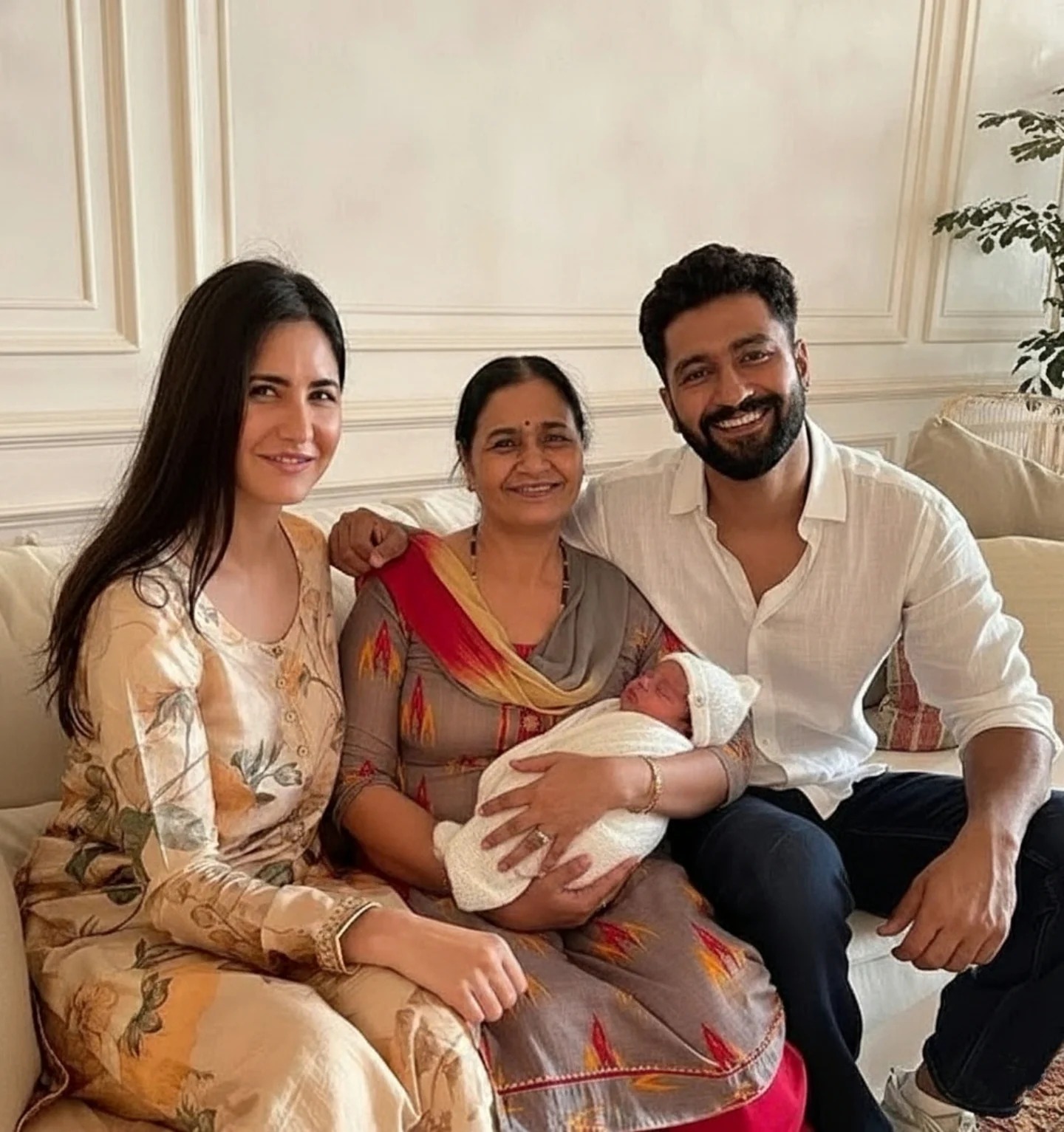 जी हां, सोशल मीडिया पर दो तस्वीरें वायरल हुई हैं..जिनमें जमाने के आगे विक्की-कटरीना के बेटे की झलक दिखाई दी है। पहली तस्वीर ये है..जिसमें न्यूली मॉम बनीं कटरीना अपने पति विक्की और सास वीणा कौशल के साथ घर में बैठी हुई नजर आ रही हैं। फोटो में कटरीना बेज कलर का फ्लोरल प्रिंटेड सूट पहने हुए हैं। उनके बाल खुले हुए हैं। वहीं, विक़्क़ी शर्ट-जींस में हैं। तो, कैट की सास वीणा अपनी गोद में पोते को लिए हुए दिखाई दे रही है। तस्वीर में सभी हंसते हुए नजर आ रहे हैं।