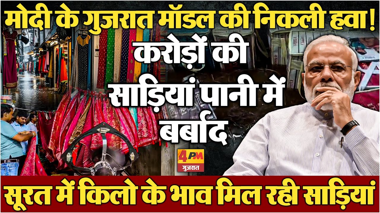 4पीएम न्यूज नेटवर्कः गुजरात भारत का एक प्रमुख औद्योगिक और व्यापारिक केंद्र है….. जो लंबे समय से “वाइब्रेंट गुजरात” और “गुजरात मॉडल” के नाम से जाना जाता है……. यह मॉडल विकास, बुनियादी ढांचे और आर्थिक प्रगति का प्रतीक माना जाता है……. जिसे प्रधानमंत्री नरेंद्र मोदी ने अपने मुख्यमंत्री कार्यकाल के दौरान और बाद में राष्ट्रीय स्तर पर प्रचारित किया……. हालांकि, हाल की घटनाओं ने इस मॉडल पर सवाल उठाए हैं…… जून 2025 में सूरत में आई भारी बाढ़ ने शहर के कपड़ा उद्योग को भारी नुकसान पहुंचाया…… जिसके चलते करोड़ों रुपये की साड़ियां और कपड़े पानी में बर्बाद हो गए……. इसके साथ ही सोशल मीडिया और समाचारों में यह दावा भी सामने आया कि सूरत के बाजारों में साड़ियां “किलो के भाव” बिक रही हैं…….