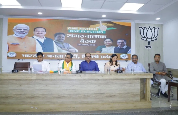 वन नेशन वन इलेक्शन' पर दिल्ली बीजेपी कार्यालय में बैठक हुई। ये बैठक बीजेपी के राष्ट्रीय महामंत्री सुनील बंसल के नेतृत्व में हुई। बैठक में इस मुद्दे पर दिल्ली के विधायकों से चर्चा की गई।