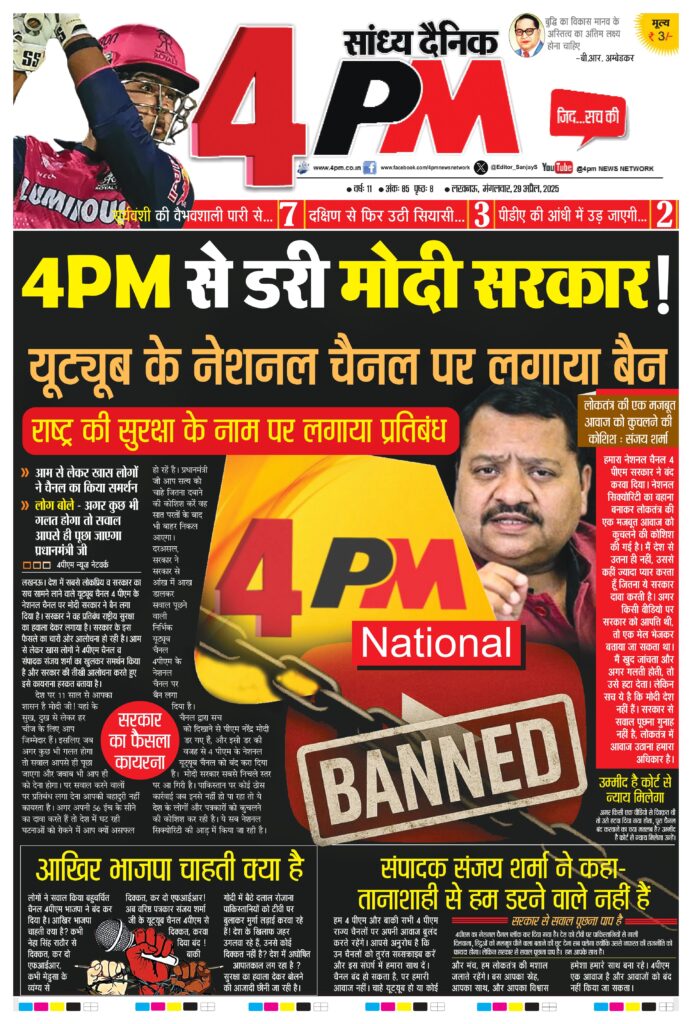 लखनऊ। देश में सबसे लोकप्रिय व सरकार का सच सामने लाने वाले यूट्यूब चैनल 4 पीएम के नेशनल चैनल पर मोदी सरकार ने बैन लगा दिया है। सरकार ने वह प्रतिबंध राष्टï्रीय सुरक्षा का हवाला देकर लगाया है। सरकार के इस फैसले का चारों ओर आलोचना हो रही है। आम से लेकर खास लोगों ने 4पीएम चैनल व संपादक संजय शर्मा का खुलकर समर्थन किया है और सरकार की तीखी आलोचना करते हुए इसे कायराना हरकत बताया है। देश पर 11 साल से आपका शासन है मोदी जी! यहां के सुख, दुख से लेकर हर चीज के लिए आप जिम्मेदार हैं। इसलिए जब अगर कुछ भी गलत होगा तो सवाल आपसे ही पूछा जाएगा और जवाब भी आप ही को देना होगा। पर सवाल करने वालों पर प्रतिबंध लगा देना आपकी बहादुरी नहीं कायरता है। अगर अपनी 56 इंच के सीने का दावा करते हैं तो देश में घट रही घटनाओं को रोकने में आप क्यों असफल हो रहें है। प्रधानमंत्री जी आप सत्य को चाहे जितना दबाने की कोशिश करें वह सात परतों के बाद भी बाहर निकल आएगा। दरअसल, सरकार ने सरकार से आंख में आख डालकर सवाल पूछने वाली निर्भिक यूट्यूब चैनल 4पीएम के नेशनल चैनल पर बैन लगा दिया है। चैनल द्वारा सच को दिखाने से पीएम नरेंद्र मोदी डर गए हैं, और इसी डर की वजह से 4 पीएम के नेशनल यूट्यूब चैनल को बंद करा दिया है। मोदी सरकार सबसे निचले स्तर पर आ गिरी है। पाकिस्तान पर कोई ठोस कार्रवाई जब इनसे नहीं हो पा रहा तो ये देश के लोगों और पत्रकारों को कुचलने की कोशिश कर रही है। ये सब नेशनल सिक्योरिटी की आड़ में किया जा रही है।