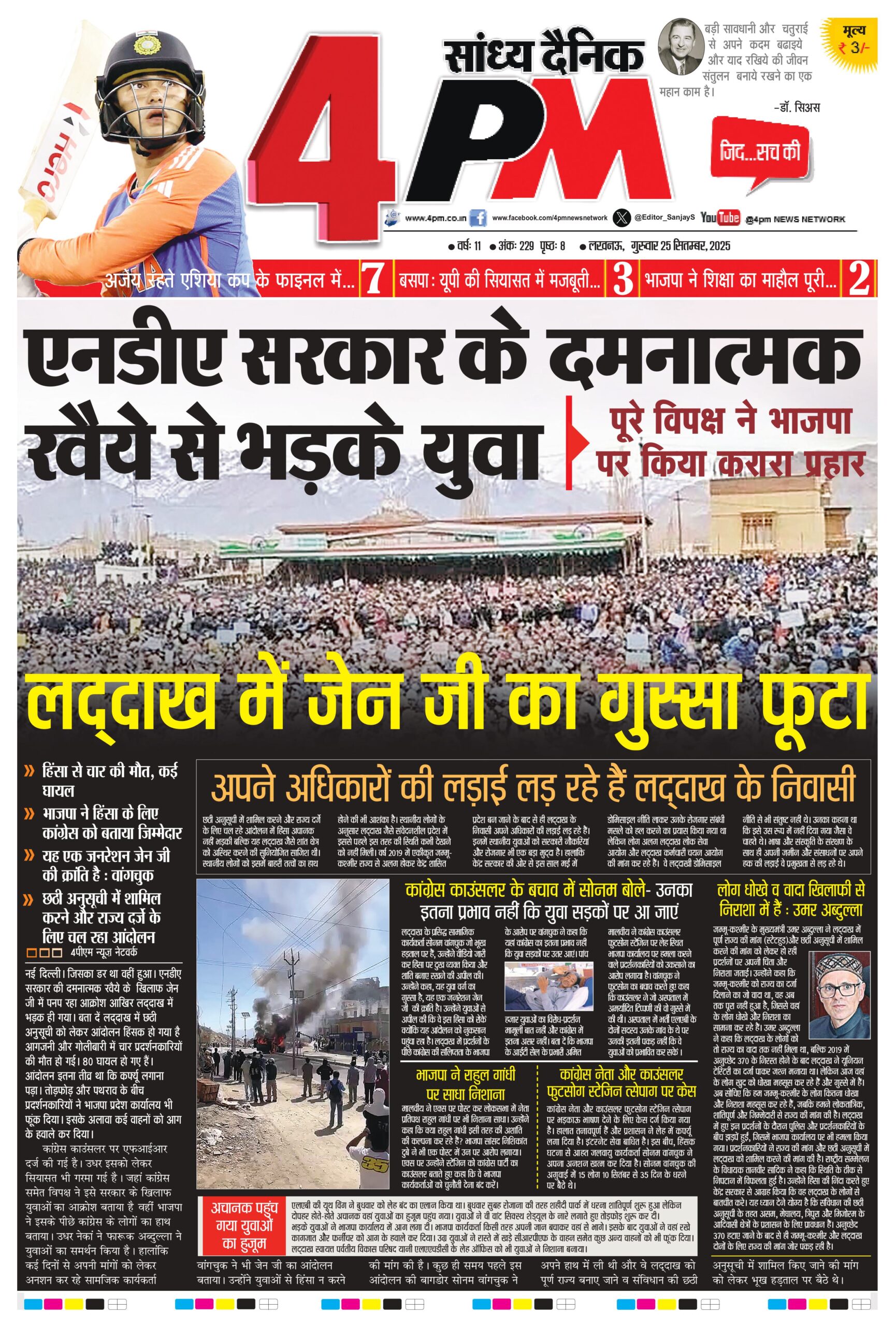 नई दिल्ली। जिसका डर था वहीं हुआ। एनडीए सरकार की दमनात्मक रवैये के खिलाफ जेन जी में पनप रहा आक्रोश आखिर लद्दाख में भड़क ही गया। बता दें लद्दाख में छठी अनुसूची को लेकर आंदोलन हिंसक हो गया है आगजनी और गोलीबारी में चार प्रदर्शनकारियों की मौत हो गई। 80 घायल हो गए हैं। आंदोलन इतना तीव्र था कि कफ्र्यू लगाना पड़ा। तोडफ़ोड़ और पथराव के बीच प्रदर्शनकारियों ने भाजपा प्रदेश कार्यालय भी फूंक दिया। इसके अलावा कई वाहनों को आग के हवाले कर दिया।