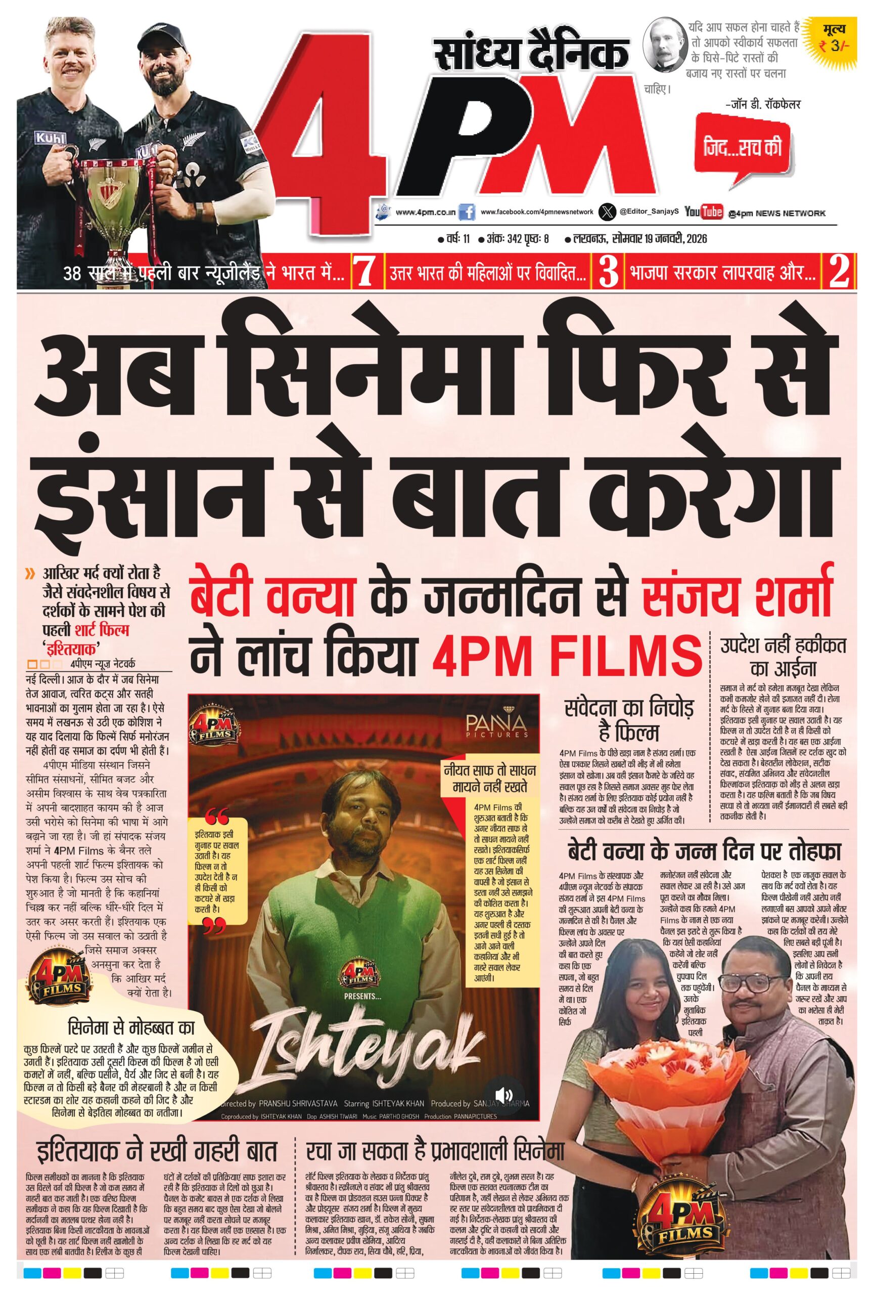 4पीएम मीडिया संस्थान जिसने सीमित संसाधनों, सीमित बजट और असीम विश्वास के साथ वेब पत्रकारिता में अपनी बादशाहत कायम की है आज उसी भरोसे को सिनेमा की भाषा में आगे बढ़ाने जा रहा है। जी हां संपादक संजय शर्मा ने 4 PM Films के बैनर तले अपनी पहली शार्ट फिल्म इश्तिायक को पेश किया है। फिल्म उस सोच की शुरुआत है जो मानती है कि कहानियां चिल्ला कर नहीं बल्कि धीरे-धीरे दिल में उतर कर असर करती हैं। इश्तियाक एक ऐसी फिल्म जो उस सवाल को उठाती है जिसे समाज अक्सर अनसुना कर देता है कि आखिर मर्द क्यों रोता है।