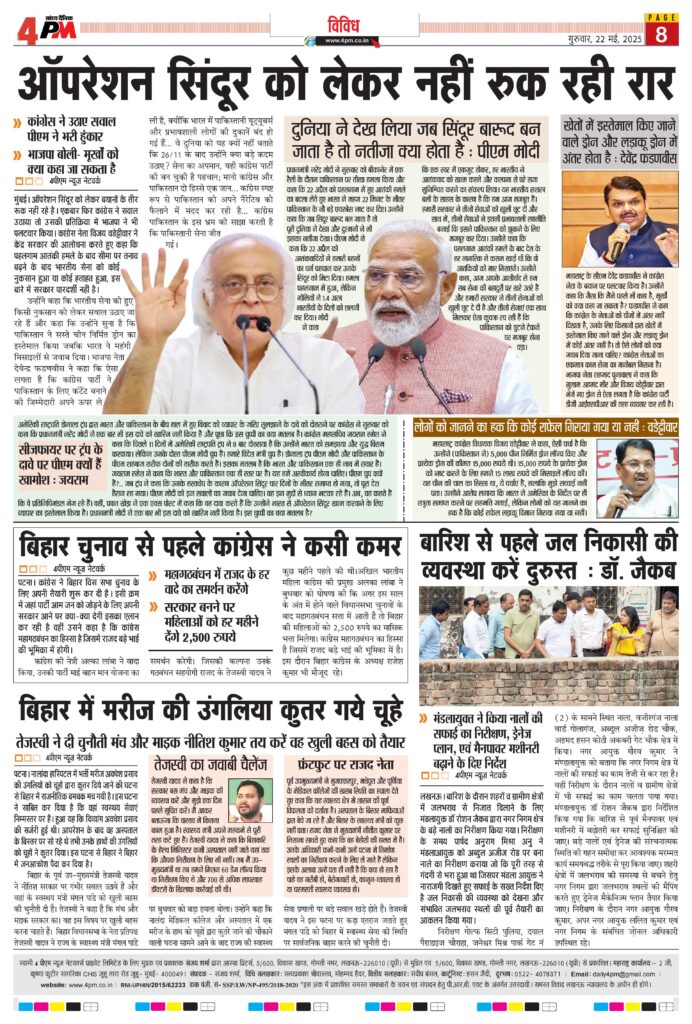 उन्होंने कहा कि भारतीय सेना को हुए किसी नुकसान को लेकर सवाल उठाए जा रहे हैं और कहा कि उन्होंने सुना है कि पाकिस्तान ने सस्ते चीन निर्मित ड्रोन का इस्तेमाल किया जबकि भारत ने महंगी मिसाइलों से जवाब दिया। भाजपा नेता देवेन्द्र फडणवीस ने कहा कि ऐसा लगता है कि कांग्रेस पार्टी ने पाकिस्तान के लिए कंटेंट बनाने की जिम्मेदारी अपने ऊपर ले ली है, क्योंकि भारत में पाकिस्तानी यूट्यूबर्स और प्रभावशाली लोगों की दुकानें बंद हो गई हैं… वे दुनिया को यह क्यों नहीं बताते कि 26/11 के बाद उन्होंने क्या बड़े कदम उठाए? सेना का अपमान, यही कांग्रेस पार्टी की बन चुकी है पहचान; मानो कांग्रेस और पाकिस्तान दो हिस्से एक जान… कांग्रेस स्पष्ट रूप से पाकिस्तान को अपने नैरेटिव को फैलाने में मदद कर रही है… कांग्रेस पाकिस्तान के इस भ्रम को साझा करती है कि पाकिस्तानी सेना जीत गई।