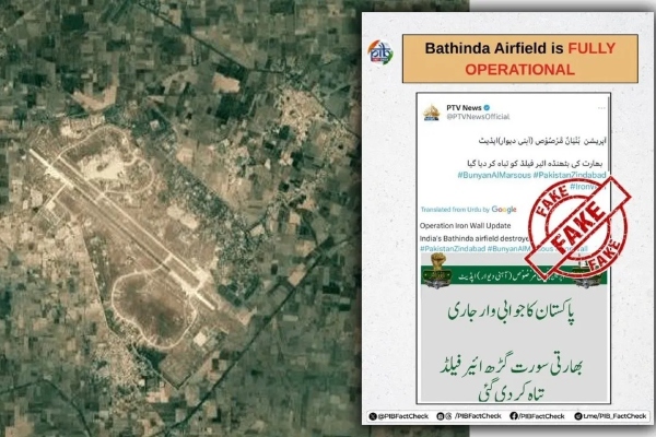 पाकिस्तान की ओर से सोशल मीडिया पर यह दावा किया गया कि उसकी सेना ने भारत के बठिंडा एयरफील्ड को पूरी तरह तबाह कर दिया है। इस दावे को भारत सरकार की फैक्ट चेक एजेंसी PIB (Press Information Bureau) ने पूरी तरह फर्जी और बेबुनियाद बताया है। PIB ने अपने फैक्ट चेक में स्पष्ट किया कि बठिंडा एयरफील्ड पूरी तरह सुरक्षित है और पाकिस्तान का यह दावा पूरी तरह झूठा है। PIB लगातार सोशल मीडिया पर फैल रही फर्जी खबरों का पर्दाफाश कर रहा है और जनता से अपील कर रहा है कि केवल आधिकारिक और विश्वसनीय सूत्रों से ही जानकारी प्राप्त करें। पाकिस्तान द्वारा संसद में भी इस तरह के झूठे दावे किए गए हैं, जिन्हें भारत सरकार के विभिन्न स्रोतों ने सिरे से खारिज कर दिया है। ऑपरेशन सिंदूर के बाद से पाकिस्तान न सिर्फ सैन्य मोर्चे पर विफल रहा है, बल्कि कूटनीतिक और सूचना युद्ध में भी उसकी पोल खुलती जा रही है।