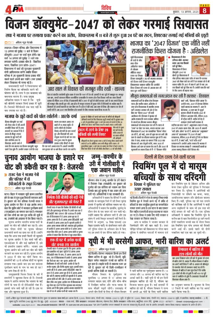 लखनऊ। विधान परिषद और विधानसभा में 13 अगस्त को पूर्वाह्न 11 बजे से विजन डॉक्युमेंट-2047 पर चर्चा शुरू होगी। यह चर्चा 14 अगस्त को पूर्वाह्न 11 बजे तक लगातार चलेगी। इसका थीम है- विकसित भारत, विकसित उत्तर प्रदेश-2047। विधानसभा में चर्चा की शुरुआत मुख्यमंत्री योगी आदित्यनाथ करेंगे जबकि विधान परिषद में उप मुख्यमंत्री केशव प्रसाद मौर्य सबसे पहले अपनी बात रखेंगे। उधर इसको लेकर सियासत भी गरमा गई है।
