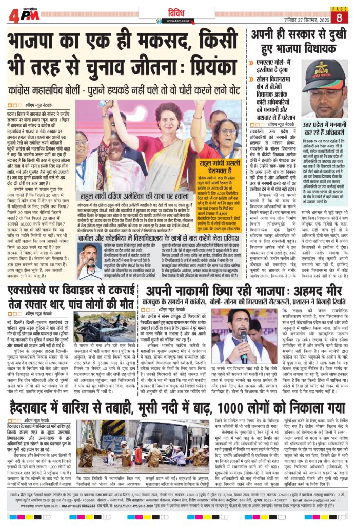 पटना। बिहार में वायनाड की सांसद ने एनडीए सरकार पर बोला हमला न्यूज पटना । बिहार में वायनाड की सांसद व कांग्रेस क ी महासचिव ने भाजपा व मोदी सरकार पर जमकर हमला बोला। पहली बार अपनी एक चुनावी रैली को संबोधित करने मोतिहारी पहुंचीं कांग्रेस की महासचिव प्रियंका गांधी वाड्रा ने कहा कि भारतीय जनता पार्टी का एक ही मकसद है कि किसी भी तरह से चुनाव जीतना और सत्ता में बने रहना। इसके लिए यह लोग जाति, धर्म और घुसपैठ जैसे मुद्दों को उछालते हैं। जब यह पुराने हथकंडे नहीं चले तो अब वोट की चोरी पर उतर आए हैं।