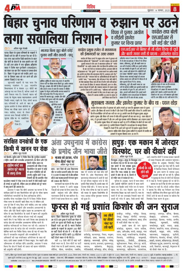 पटना। बिहार के चुनाव परिणामों के रुझानों ने विपक्षी दलों के खेमे में हलचल पैदा कर दी है। एक तरफ जहां कांग्रेस दिल्ली कार्यालय के बाहर वोट चोरी के पोस्टरों के साथ प्रदर्शन कर रही है। वहीं उत्तर प्रदेश में सपा मुखिया अखिलेश यादव ने विशेष गहन पुनरीक्षण (एसआईआर) को लेकर एक बार फिर भाजपा पर हमला बोला है। बिहार में शुक्रवार को एनडीए अपने 160 पार के विशाल लक्ष्य को पार करने की ओर अग्रसर दिखाई दे रहा था।
