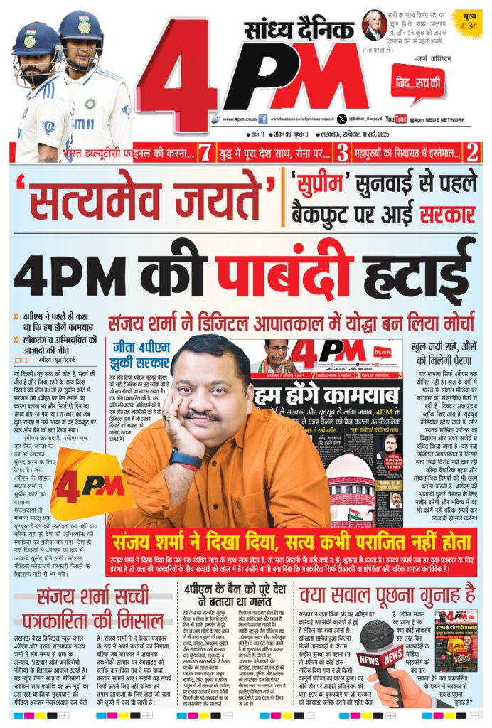 लखनऊ बेस्ड डिजिटल न्यूज चैनल 4पीएम और इसके संस्थापक संजय शर्मा ने लंबे समय से सत्ता के अन्याय, भ्रष्टाचार और जनविरोधी नीतियों के खिलाफ आवाज उठाई है। यह न्यूज चैनल सत्ता के गलियारों में खटकने लगा क्योंकि वह उन मुद्दों को उठा रहा था जिन्हें मुख्यधारा की मीडिया अक्सर नजऱअंदाज़ कर देती है। संजय शर्मा ने न केवल पत्रकार के रूप में अपने कर्तव्यों को निभाया, बल्कि जब सरकार ने अचानक तकनीकी आधार पर वेबसाइट को ब्लॉक कर दिया तब वे एक योद्धा बनकर सामने आए। उन्होंने यह संघर्ष सिर्फ अपने लिए नहीं बल्कि उन तमाम आवाज़ों के लिए लड़ा जो सत्ता की चुप्पी में दबा दी जाती हैं।