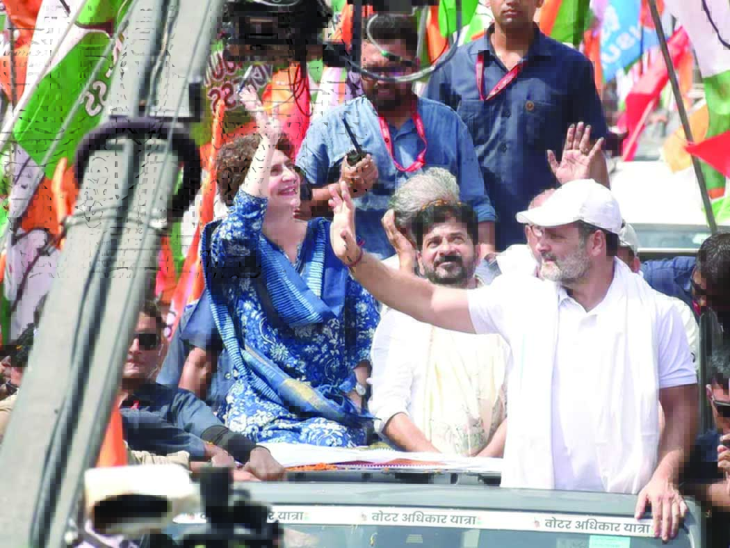 सुपौल। कांग्रेस महासचिव प्रियंका गांधी वाड्रा मंगलवार को अपने भाई और लोकसभा में नेता प्रतिपक्ष राहुल गांधी के साथ वोटर अधिकार यात्रा में शामिल हुईं। यात्रा के दौरान उनके साथ तेलंगाना के मुख्यमंत्री रेवंत रेड्डी, आरजेडी नेता तेजस्वी यादव और इंडिया गठबंधन के अन्य नेता भी मौजूद रहे। सभी नेताओं को एक एसयूवी की छत पर बैठकर भीड़ का अभिवादन करते देखा गया। सोमवार को विराम के बाद मंगलवार को यात्रा दोबारा शुरू हुई।