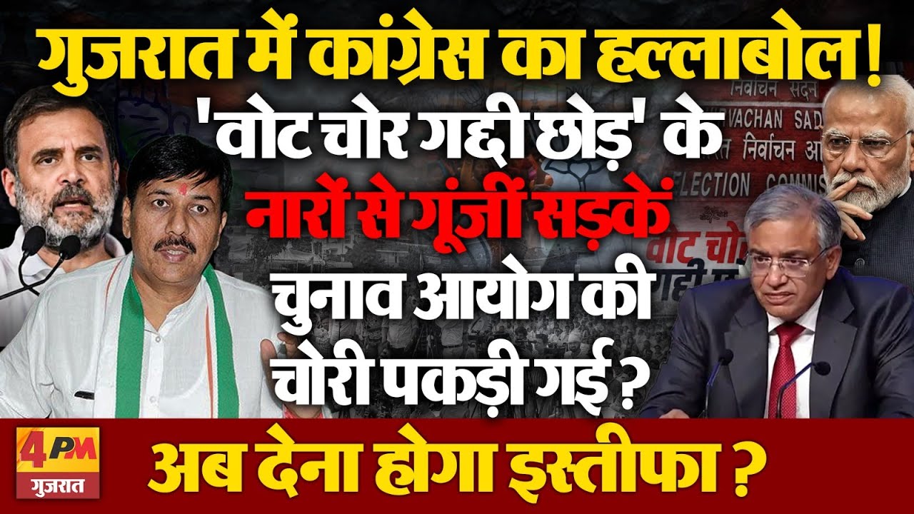 4पीएम न्यूज नेटवर्कः दोस्तों गुजरात देश के प्रधानमंत्री नरेंद्र मोदी का गृह राज्य है….. जो इन दिनों राजनीतिक उथल-पुथल का केंद्र बना हुआ है…… विपक्षी दल कांग्रेस ने यहां ‘वोट चोरी’ के खिलाफ जोरदार प्रदर्शन शुरू कर दिए हैं…… सड़कों पर हजारों कार्यकर्ता उतर आए हैं….. और हर तरफ ‘वोट चोर गद्दी छोड़’ के नारे गूंज रहे हैं…… पार्टी का आरोप है कि चुनाव आयोग और सत्ताधारी भारतीय जनता पार्टी की मिलीभगत से वोटर लिस्ट में बड़े पैमाने पर धांधली हो रही है…… जिससे लोकतंत्र खतरे में पड़ गया है…… वहीं इस मुद्दे ने पूरे देश में हलचल मचा दी है….. और मोदी सरकार को हिलाकर रख दिया है…. वहीं इस खबर में जानेंगे क्या यह सिर्फ राजनीतिक आरोप हैं…… या वाकई में वोट चोरी का बड़ा घोटाला सामने आ रहा है……