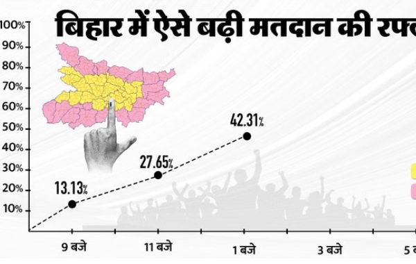 पहले चरण की 121 सीटों पर दोपहर एक बजे तक 42.31 प्रतिशत मतदान हुआ। निर्वाचन आयोग से प्राप्त जानकारी के अनुसार दोपहर 1 बजे तक औसतन 42.31 प्रतिशत मतदान दर्ज किया गया है। अब तक गोपालगंज जिले में सर्वाधिक 46.73 प्रतिशत वोटिंग हुई है, जबकि पटना में सबसे कम 37.72 प्रतिशत मतदाताओं ने अपने मताधिकार का प्रयोग किया है। अन्य जिलों में मधेपुरा में 44.16, सहरसा में 44.20, दरभंगा में 39.35, मुजफ्फरपुर में 45.41, सिवान में 41.20, सारण में 43.06, वैशाली में 42.60, समस्तीपुर में 43.03, बेगूसराय में 46.02, खगड़िया में 42.94, मुंगेर में 41.47, लखीसराय में 46.37, शेखपुरा में 41.23, नालंदा में 41.87, भोजपुर में 41.15 और बक्सर में 41.10 प्रतिशत मतदान दर्ज किया गया है। निर्वाचन आयोग के अनुसार मतदान शांतिपूर्ण ढंग से जारी है।