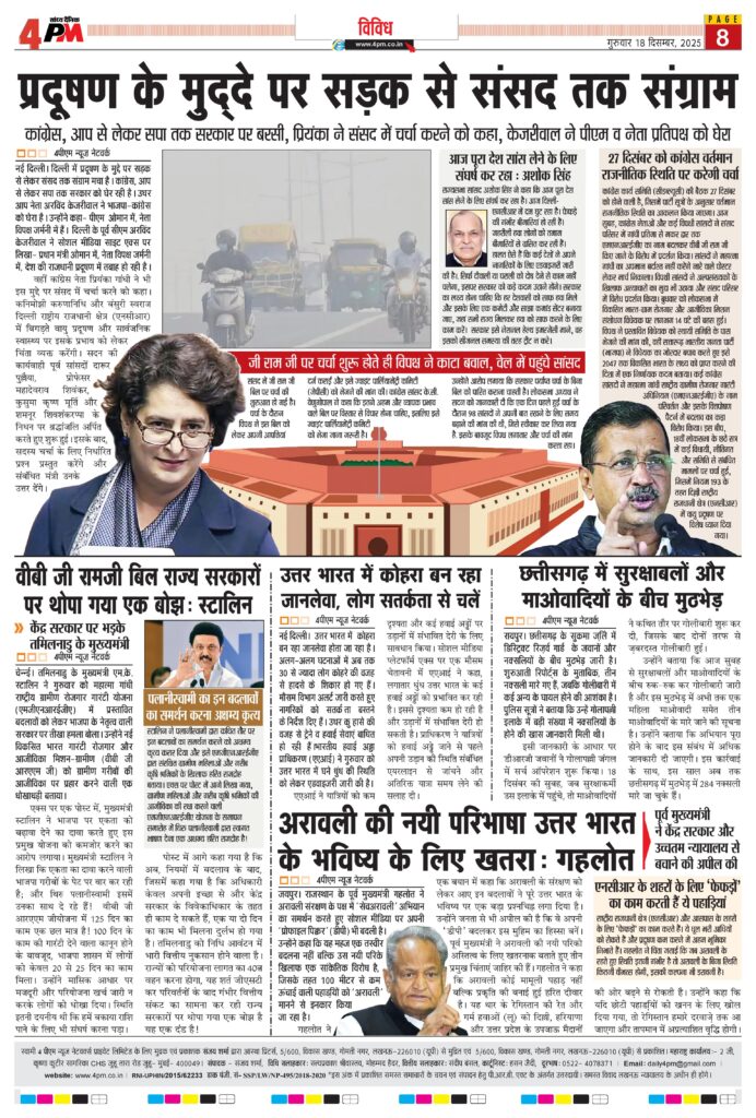 कांग्रेस कार्य समिति (सीडब्ल्यूसी) की बैठक 27 दिसंबर को होने वाली है, जिसमें पार्टी सूत्रों के अनुसार वर्तमान राजनीतिक स्थिति का आकलन किया जाएगा। आज सुबह, कांग्रेस नेताओं और कई विपक्षी सांसदों ने संसद परिसर में गांधी प्रतिमा से मकर द्वार तक एमएनआरईजीए का नाम बदलकर वीबी जी राम जी किए जाने के विरोध में प्रदर्शन किया। सांसदों ने महात्मा गांधी का अपमान बर्दाश्त नहीं करेंगे नारे वाले पोस्टर लेकर मार्च निकाला। विपक्षी सांसदों ने अल्पसंख्यकों के खिलाफ अत्याचारों का मुद्दा भी उठाया और संसद परिसर में विरोध प्रदर्शन किया। बुधवार को लोकसभा में विकसित भारत-ग्राम रोजगार और आजीविका मिशन संशोधन विधेयक पर लगभग 14 घंटे की बहस हुई। विपक्ष ने प्रस्तावित विधेयक को स्थायी समिति के पास भेजने की मांग की, वहीं सत्तारूढ़ भारतीय जनता पार्टी (भाजपा) ने विधेयक का जोरदार बचाव करते हुए इसे 2047 तक विकसित भारत के लक्ष्य को प्राप्त करने की दिशा में एक निर्णायक कदम बताया। कई कांग्रेस सांसदों ने महात्मा गांधी राष्ट्रीय ग्रामीण रोजगार गारंटी अधिनियम (एमएनआरईजीए) के नाम परिवर्तन और इसके वित्तपोषण पैटर्न में बदलाव का कड़ा विरोध किया। इस बीच, 18वीं लोकसभा के छठे सत्र में कई विधायी, नीतिगत और समिति से संबंधित मामलों पर चर्चा हुई, जिसमें नियम 193 के तहत दिल्ली राष्ट्रीय राजधानी क्षेत्र (एनसीआर) में वायु प्रदूषण पर विशेष ध्यान दिया गया।
