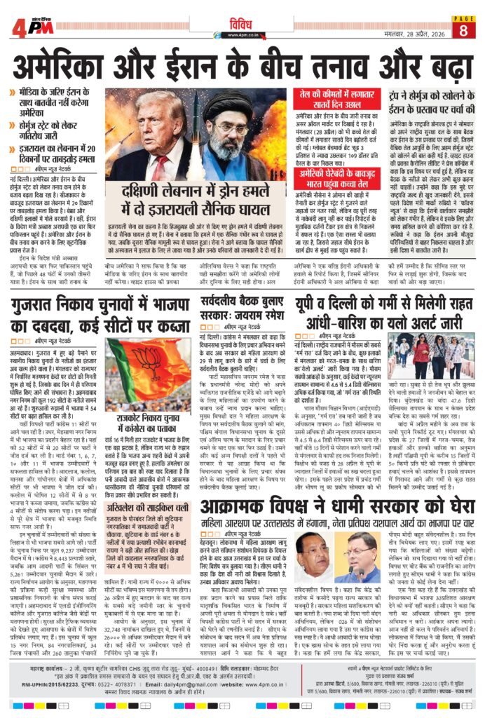 वहीं विपक्षी पार्टी कांग्रेस 11 सीटों पर आगे चल रही है। उधर, मेहसाणा नगर निगम में भी भाजपा का प्रदर्शन बेहतर रहा है। यहां की 52 सीटों में से 20 सीटों पर पार्टी ने जीत दर्ज कर ली है। वार्ड नंबर 1, 6, 7, 1० और 11 में भाजपा उम्मीदवारों ने सफलता हासिल की है। आदलाज, कलोल, मानसा और गांधीनगर क्षेत्रों में अधिकांश सीटों पर भी भाजपा ने जीत दर्ज की। कलोल में घोषित 12 सीटों में से 8 पर भाजपा ने कब्जा जमाया, जबकि कांग्रेस को 4 सीटों से संतोष करना पड़ा। इन नतीजों से पूरे क्षेत्र में भाजपा की मजबूत स्थिति साफ नजर आती है।