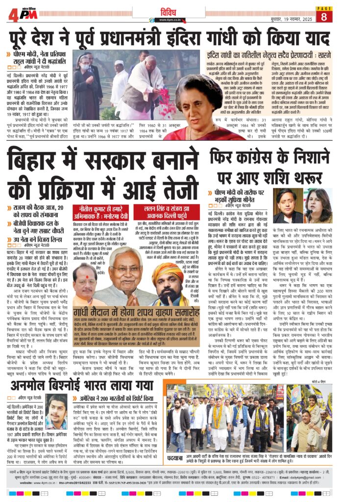 प्रधानमंत्री नरेन्द्र मोदी ने बुधवार को पूर्व प्रधानमंत्री इंदिरा गांधी को उनकी जयंती पर श्रद्धांजलि दी। मोदी ने ‘एक्स’ पर एक पोस्ट में कहा, ‘‘पूर्व प्रधानमंत्री श्रीमती इंदिरा गांधी जी को उनकी जयंती पर श्रद्धांजलि।’’ इंदिरा गांधी का जन्म 19 नवंबर 1917 को हुआ था। उन्होंने 1966 से 1977 तक और फिर 1980 से 31 अक्टूबर 1984 तक देश की प्रधानमंत्री के रूप में कार्यभार संभाला। 31 अक्टूबर 1984 को उनकी हत्या कर दी गयी थी। इसके अलावा राहुल गांधी, सोनिया गांधी ने मल्लिकार्जुन खरगे के साथ शक्ति स्थल पर पूर्व पीएम इंदिरा गांधी को उनकी 108वीं जयंती पर श्रद्धांजलि दी।
