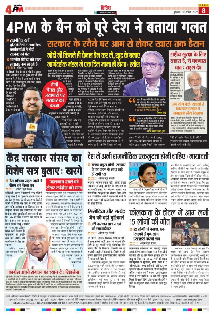 नई दिल्ली। देश के सबसे लोकप्रिय यूट्यूब चैनल 4पीएम के बैन के दूसरे दिन भी उसके समर्थन में पूरे देश से आम लोगों के साथ खास ने भी आवाज बुलंद की। सपा, राजद, कांग्रेस, शिवसेना यूबीटी जैसे राजनीतिक दलों के साथ कई वरिष्ठïïजनों, शिक्षाविदों व सामाजिक कार्यकर्ताओं ने चैनल पर बैन को गलत बताया । पत्रकार जगत के पुण्य प्रसून बाजपेई, रवीश कुमार व अजित अंजुम ने भी सरकार की कार्रवाई पर सवाल उठाया है।