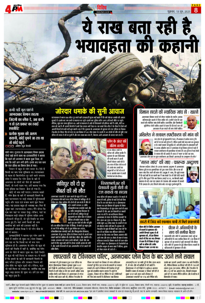 उत्तर प्रदेश के पूर्व मुख्यमंत्री ने कहा, मैं भगवान से प्रार्थना करता हूं कि भले ही यह एक बड़ी दुर्घटना है, लेकिन इसमें कोई जान-माल का नुकसान न हो। हमारे पायलट भी सुरक्षित रहें, यही मेरी प्रार्थना है। समाजवादी पार्टी के अध्यक्ष अखिलेश यादव ने अहमदाबाद में हुई विमान दुर्घटना के बारे में तत्काल स्पष्टीकरण की बृहस्पतिवार को मांग की। इस दुर्घटना में कई लोगों के हताहत होने की आशंका है। यादव ने ‘एक्स’ पर पोस्ट कर कहा, ‘‘अहमदाबाद प्लेन क्रश का तुंरत स्पष्टीकरण आए जिससे आशंकाओं का उन्मूलन हो सके।’