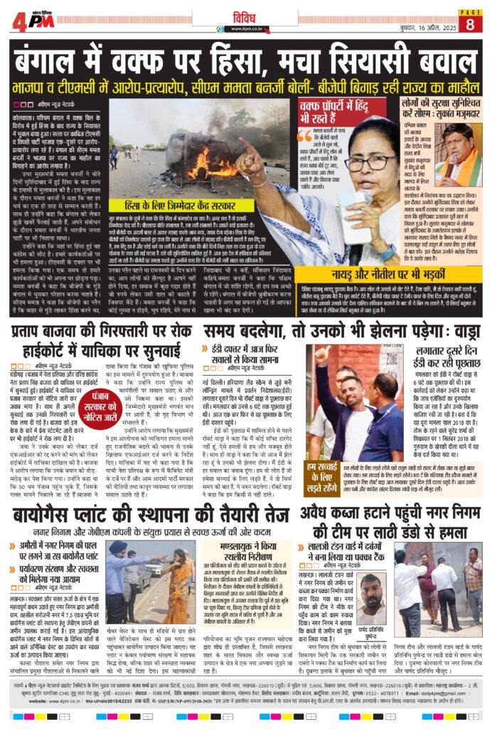 कोलकाता। पश्चिम बंगाल में वक्फ बिल के विरोध में हुई हिंसा के बाद राज्य के सियासत में भूचाल बाया हुआ। सत्ता पर काबिज टीएमसी व विपक्षी पार्टी भाजपा एक-दूसरे पर आरोप-प्रत्यारोप लगा रहें हैं। बंगाल की सीएम ममता बनर्जी ने भाजपा पर राज्य का माहौल का बिगाडऩे का आरोप लगाया है।