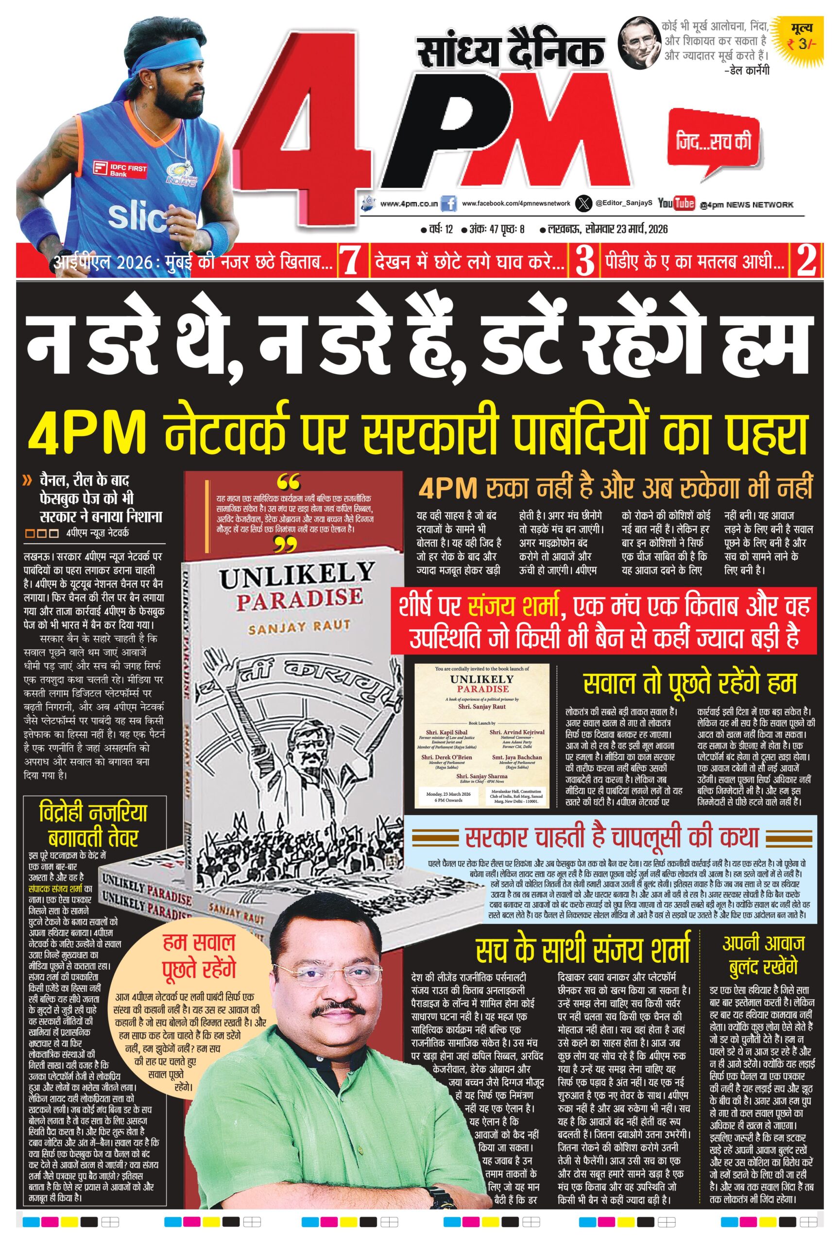 देश की लीजेंड राजनीतिक पर्सनालटी संजय राउत की किताब अनलाइकली पैराडाइज के लॉन्च में शामिल होना कोई साधारण घटना नहीं है। यह महज एक साहित्यिक कार्यक्रम नहीं बल्कि एक राजनीतिक सामाजिक संकेत है। उस मंच पर खड़ा होना जहां कपिल सिब्बल, अरविंद केजरीवाल, डेरेक ओब्रायन और जया बच्चन जैसे दिग्गज मौजूद हों यह सिर्फ एक निमंत्रण नहीं यह एक ऐलान है। यह ऐलान है कि आवाजों को कैद नहीं किया जा सकता। यह जवाब है उन तमाम ताकतों के लिए जो यह मान बैठी हैं कि डर दिखाकर दबाव बनाकर और प्लेटफॉर्म छीनकर सच को खत्म किया जा सकता है। उन्हें समझ लेना चाहिए सच किसी सर्वर पर नहीं चलता सच किसी एक चैनल की मोहताज नहीं होता। सच वहां होता है जहां उसे कहने का साहस होता है। आज जब कुछ लोग यह सोच रहे हैं कि 4पीएम रुक गया है उन्हें यह समझ लेना चाहिए यह सिर्फ एक पड़ाव है अंत नहीं। यह एक नई शुरुआत है एक नए तेवर के साथ। 4पीएम रुका नहीं है और अब रुकेगा भी नहीं। सच यह है कि आवाजें बंद नहीं होतीं वह रूप बदलती हैं। जितना दबाओगे उतना उभरेंगी। जितना रोकने की कोशिश करोगे उतनी तेजी से फैलेंगी। आज उसी सच का एक और ठोस सबूत हमारे सामने खड़ा है एक मंच एक किताब और वह उपस्थिति जो किसी भी बैन से कहीं ज्यादा बड़ी है।