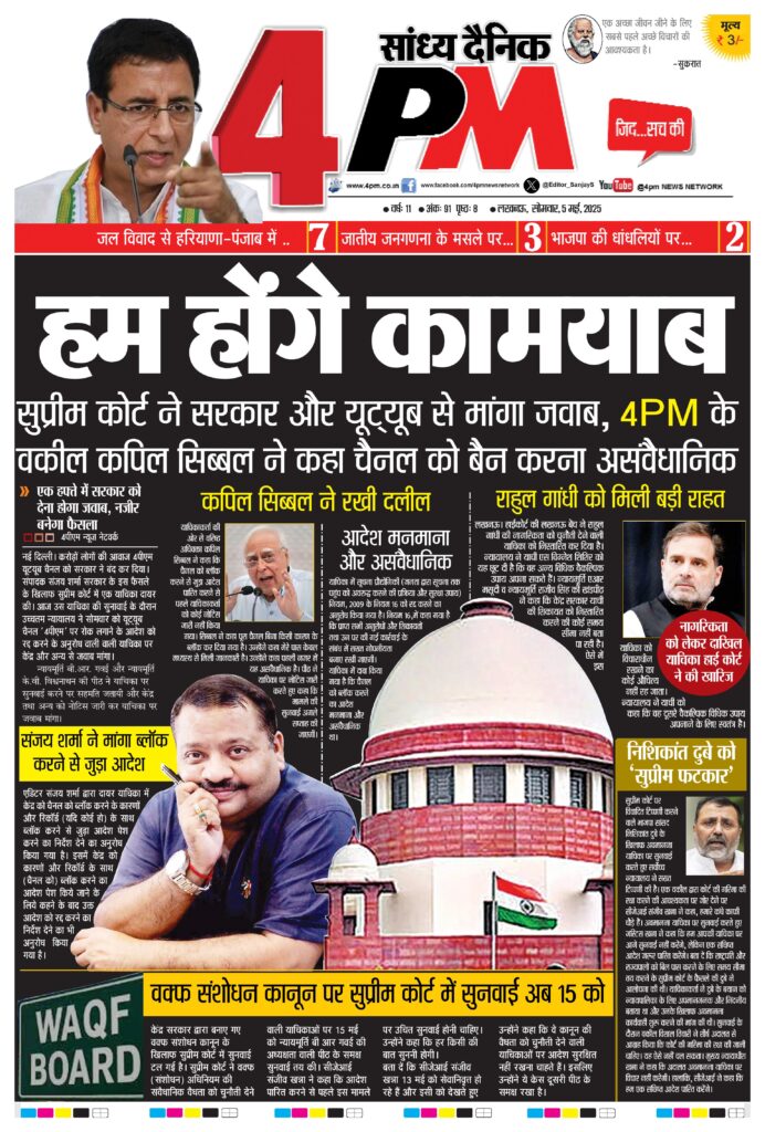 नई दिल्ली। करोड़ों लोगों की आवाज 4पीएम यूटयूब चैनल को सरकार ने बंद कर दिया। संपादक संजय शर्मा सरकार के इस फैसले के खिलाफ सुप्रीम कोर्ट में एक याचिका दायर की। आज उस याचिका की सुनावाई के दौरान उच्चतम न्यायालय ने सोमवार को यूट्यूब चैनल ‘4पीएम’ पर रोक लगाने के आदेश को रद्द करने के अनुरोध वाली वाली याचिका पर केंद्र और अन्य से जवाब मांगा।